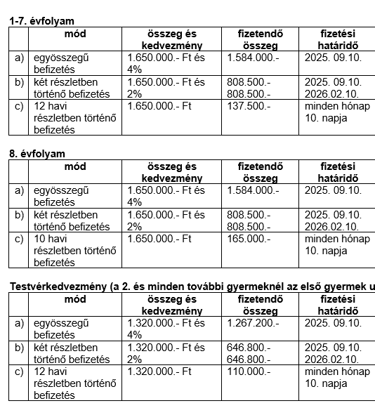 A tanulói jogviszony fenntartásához kapcsolódó fizetési kötelezettséget,továbbá, minden ezzel kapcsolatos befizetést (pl. ebéd, a hivatalos tankönyvi listában nem szereplő könyvek ára, stb.) az Iskola számlaszámára (ERSTE bank: 11600006-00000001-98647320) teljesítsenek.